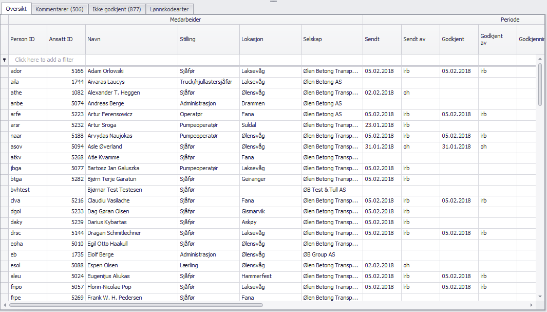 Den første fanen gir en oversikt over personer som er lagt til i overføringen, og timene som har blitt registert. Det meste er likt som i den øverste delen av skjemaet, men man får i tillegg en kolonnegrupper for "Lønnskodearter", som viser en oppsummering av lønnskodeartene som ble generert når du kjører overføringen.