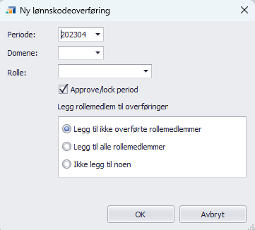 Første steg for å overføre timer til lønnskodearter er å velge "Ny overføring" i verktøylinjen. Da åpnes en dialog hvor du kan velge periode, domene og rolle som skal overfølres. I tillegg kan du velge hvorvidt perioden skal låses for personene som overføres, og hvem som skal legges til i overføringen. Merk at perioden ikke låses i det du oppretter overføringen, men senere når overføringen faktisk blir kjørt.