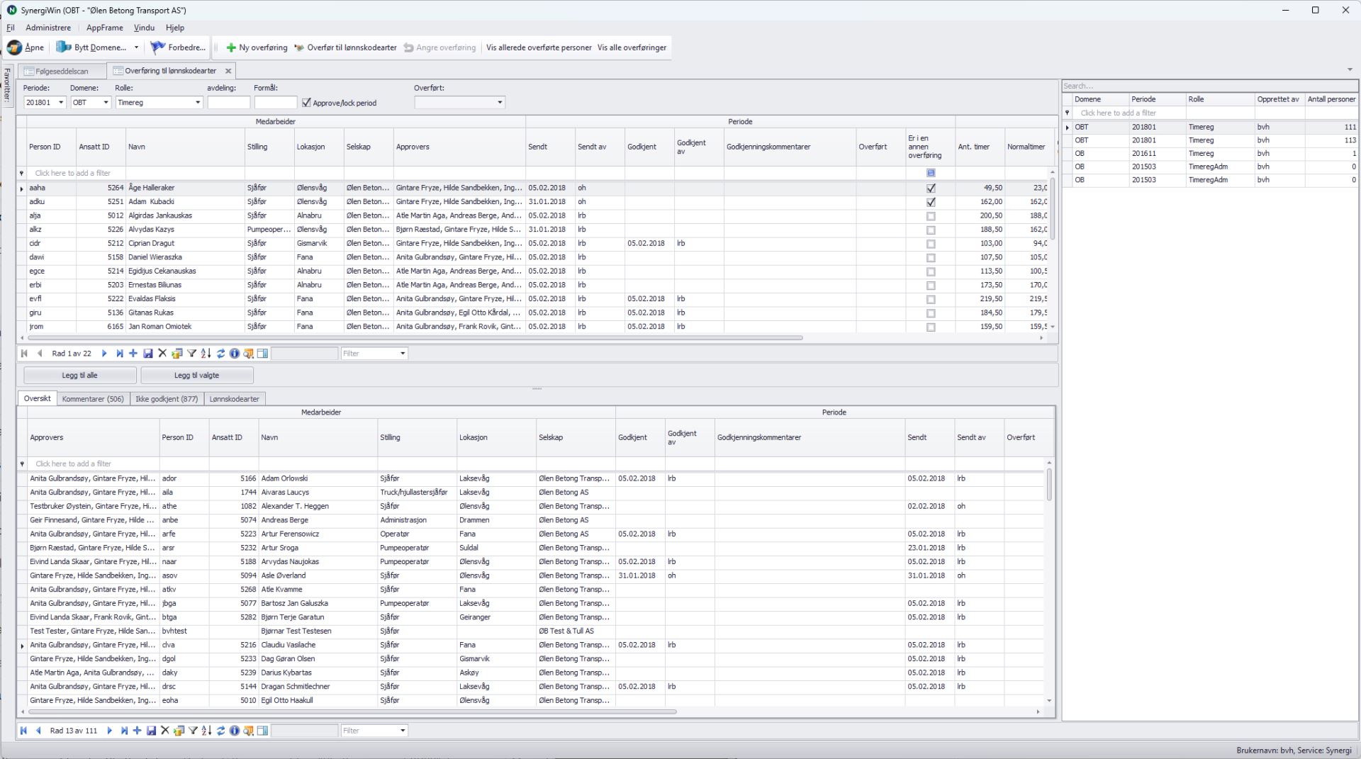Den øverste griden viser ansatte som er medlemmer i rollen, har timer registrert i perioden, og ikke allerede er lagt til i overføringen. Som standard vises ikke personer som allerede har fått timer overført til lønnskodearter i perioden. Dette kan overstyres ved å bruke knappen "Vis allerede overførte personer" i verktøylinjen.