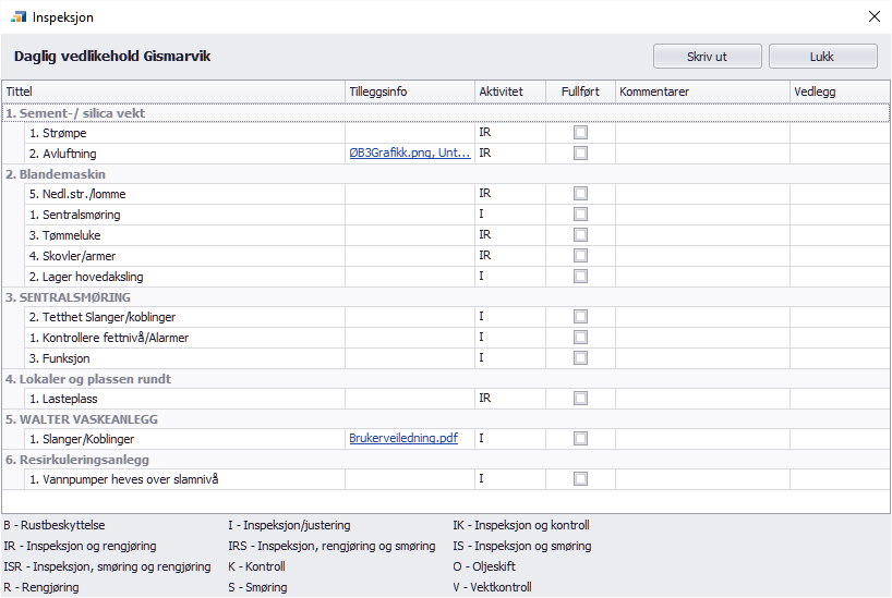 De ulike gjøremål er basert på at ansvarlig operatør selv utfører oppsatte oppgaver i henhold til oppsett. Det er noe ulik rutine med hensyn til rapportering på de forskjellige hovedområder. På enkelte områder nyttes daglige sjekklister og på andre områder månedlige.